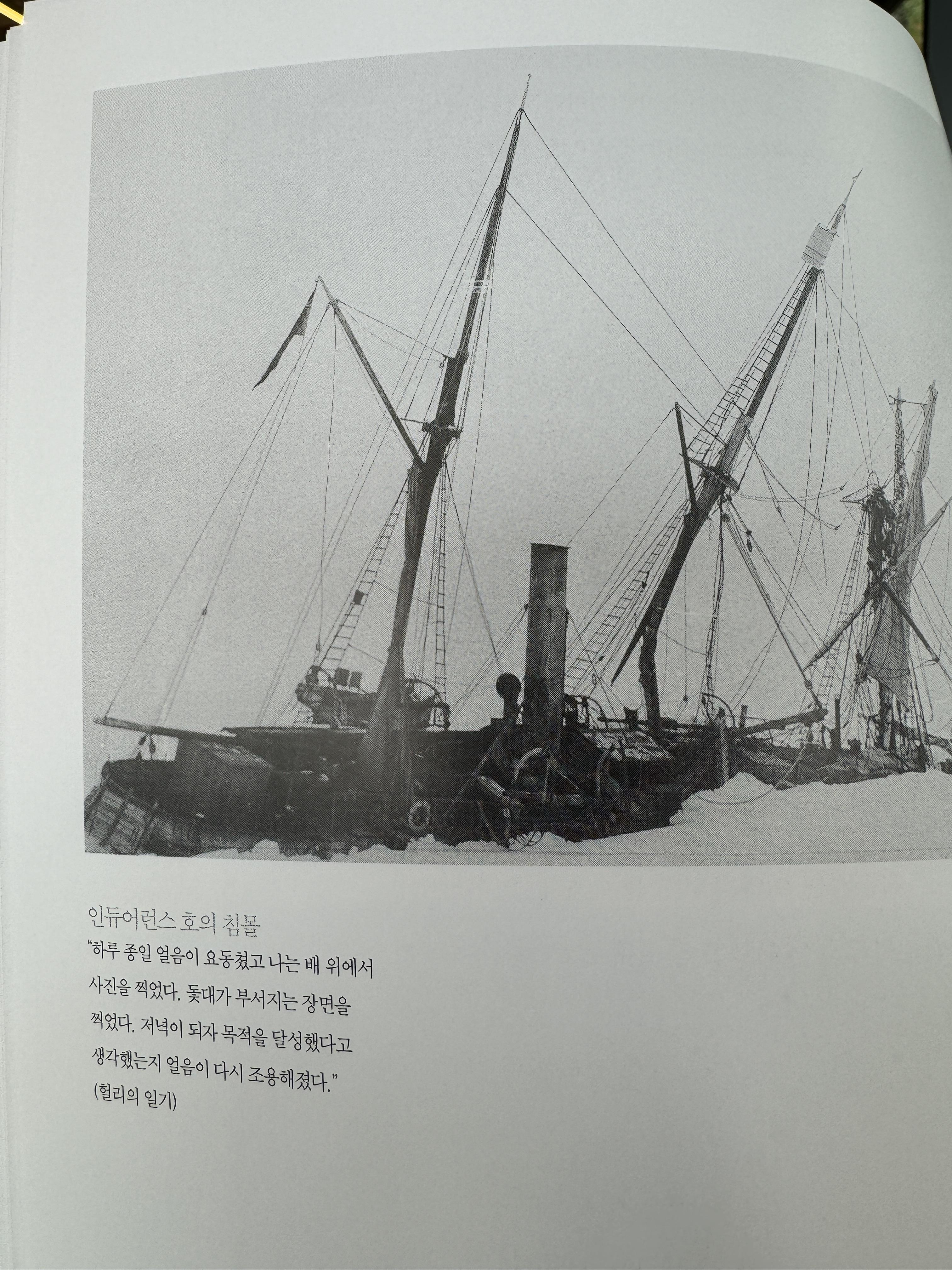 p75 “ 10월 27일 오후 4시, 온종일 거세게 밀어닥치던 압력이 마침내 최고조에 달했다. 배가 한쪽으로 기우뚱거리며 스러지는 순간, 거대한 얼음이 키와 선미재를 맹수처럼 난폭하게 찢어버렸다. 갑판이 부서져 나가고 용골이 쪼개졌다. 바닷물이 콸콸 쏟아져 들어왔고, 마침내 모든 상황이 종료되었다. 배가 서서히 아래로 가라앉기 시작했다. “