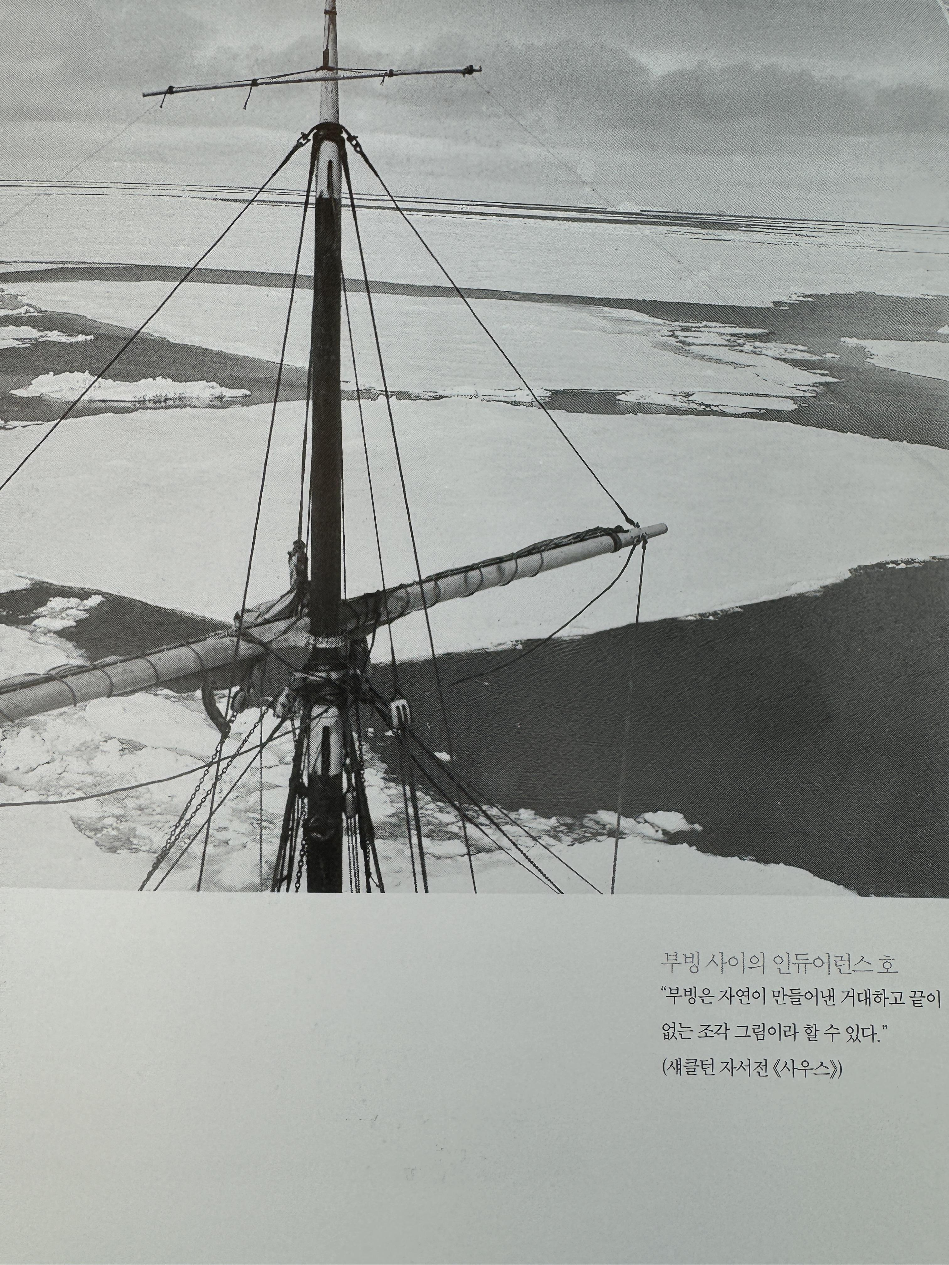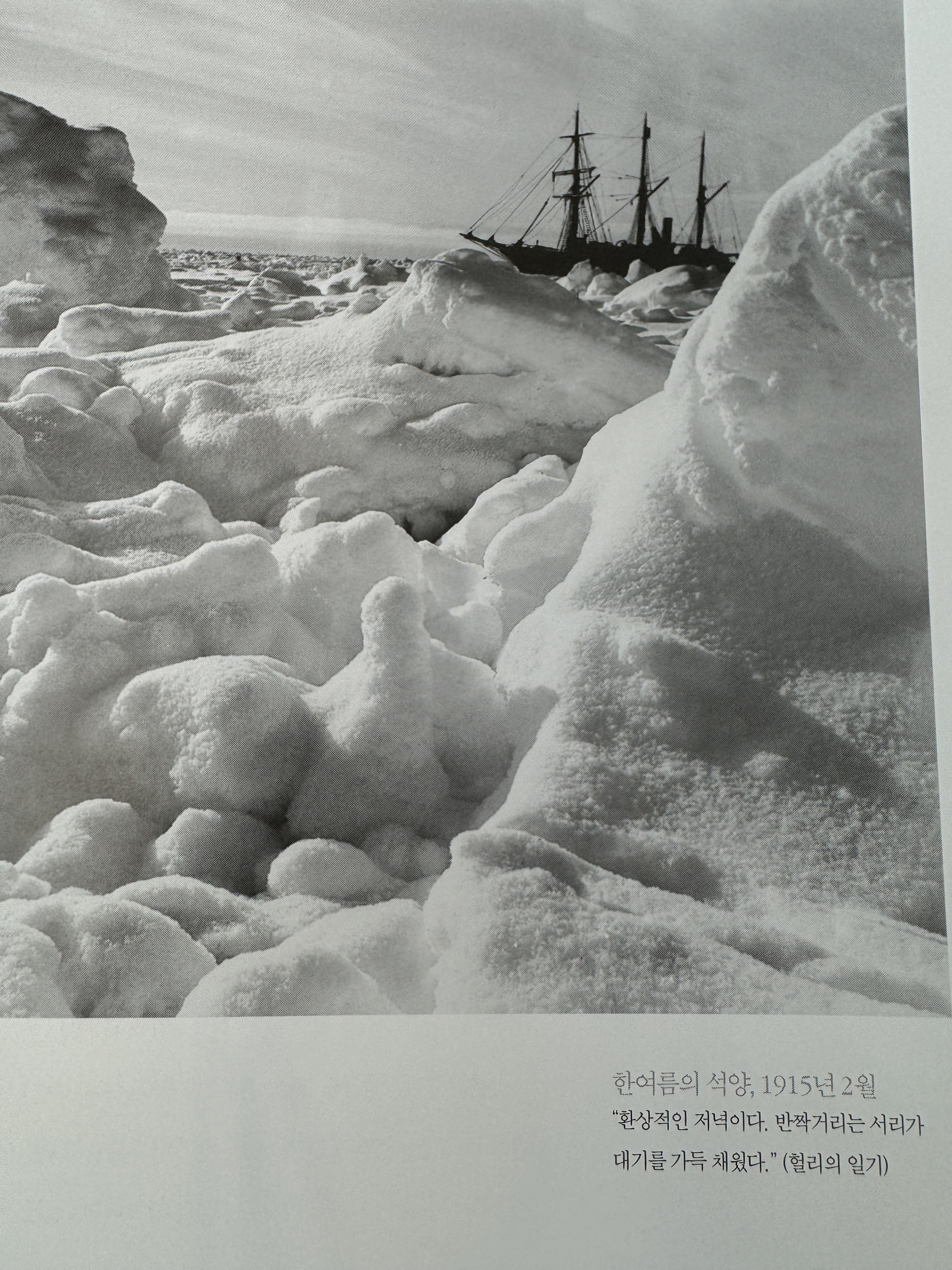 배에는 이 탐험을 기록하고자 ‘프랭크 헐리’라는 사진사가 타고 있었다. 그는 2년에 걸친 인듀어런스호의 모습과 선원들의 일상을 정성들어 담았다. 침몰하는 배의 모습, 선원들 인물사진, 갇힌 상태에서 배주위의 얼음을 깨는 모습, 기다리며 작은 캠프를 만드는 모습 등. 이 사진들 덕분에 당시 그들이 처했던 추위와 허기, 위기의 모습을 현장감 있게 느낄 수 있었다. 마지막 구조의 순간을 찍은 사진을 가만히 보고 있자면, 단 한 명의 사망자도 없었던 그들의 2년간의 모험의 안도와 떨림이 전달되는 것만 같다.