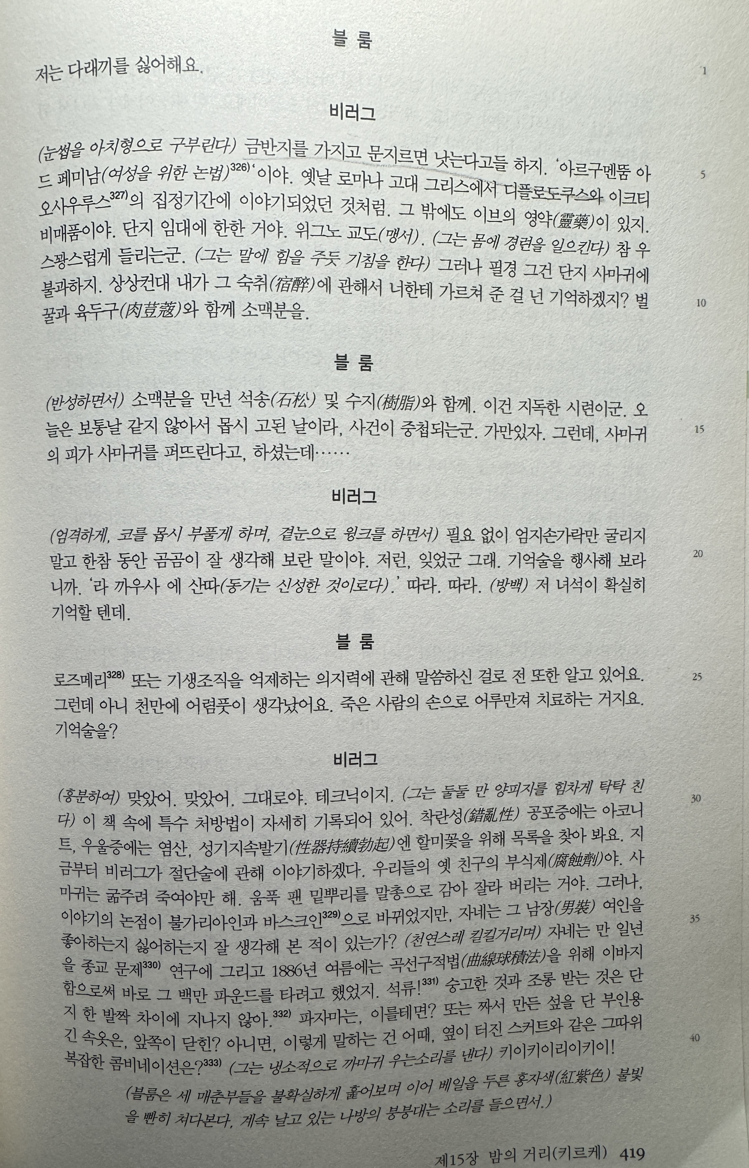 p421 “ 블룸 : 엉엉 울고 싶은 기분이에요. 용서하세요. 아아? 고로. (그는 거듭한다.) 그로 하여금 그들의 젖꼭지를 탐욕스레 빨도록 내맡기기 위해 도마뱀의 소굴을 동시적으로 찾게 하는 도다. “