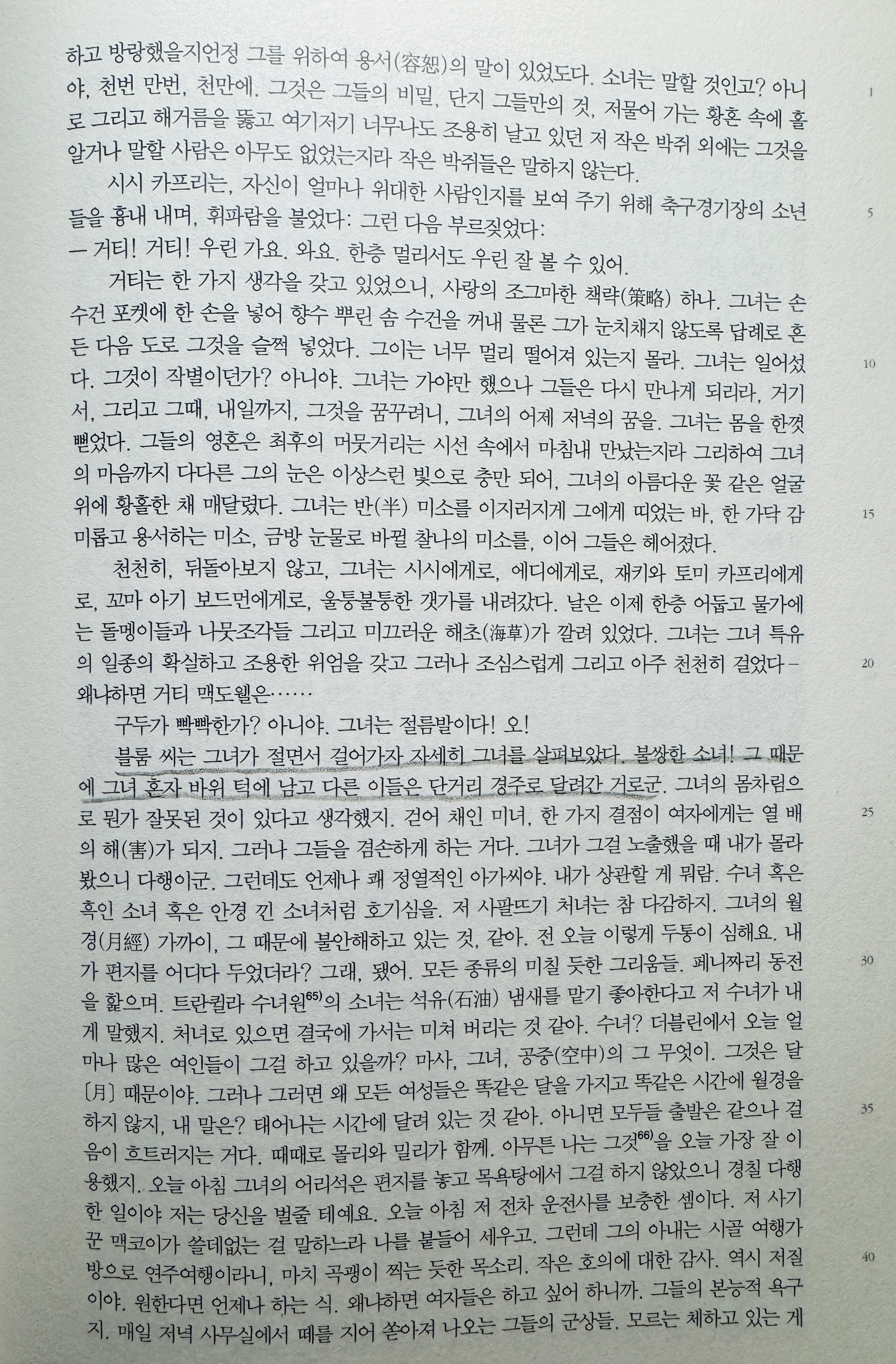 p639 “ (몰리) 그의 몸 전체에 키스하고 싶은 욕망을 이따금 느껴 또 그의 예쁘게 생긴 성기에도 말이야 너무나 순박한 것이지 나는 고것을 입에다 넣는 걸 상관하지 않겠어 만일 아무도 보고 있지 않으면 마치 고것이 핥아 달라고 바라기나 하는 듯 너무나 깨끗하고 하얀 것이 그는 앳된 얼굴로 쳐다보았지 “