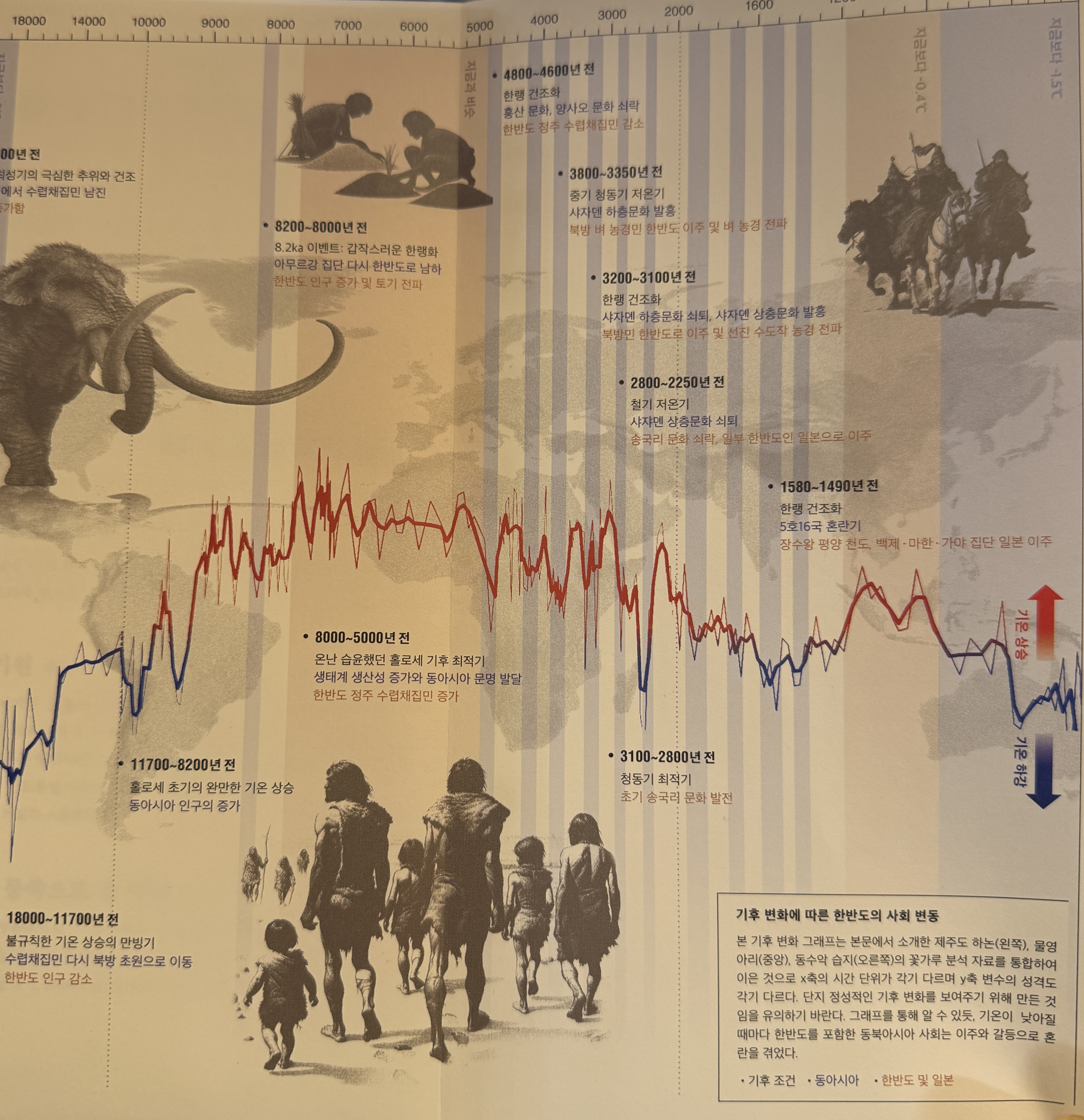한반도엔 약 5500년 전부터 중국 쪽으로부터 조금씩 정착인 들어오기 시작했다. 4200년 경부터 번성하던 라오허강 유역의 ‘사자덴’ 문화가 3200년쯤 전 기후변화로 무너지고 그 유민들이 대량 이동하여 만들어진 만든 국가가 ‘고조선’이라 작가는 추정한다. 몇 차례 따뜻한 곳을 찾는 집단은 계속 한반도로 유입되었고, 고조선의 멸망에 따라 대량의 유민들이 한반도 남쪽으로 내려왔을 것으로 본다. 이후 삼한을 거쳐 삼국시대가 펼쳐진다. 그리고 삼국의 흥망성쇠도 기후와 관련을 가진다고 보고 있다. 장수왕의 평양성 천도는 조금 더 빙기에 더 따뜻한 땅에 대한 욕심이었으며, 잦은 전쟁은 기후변화에 따른 식량 확보를 목표로 생겨난다.
