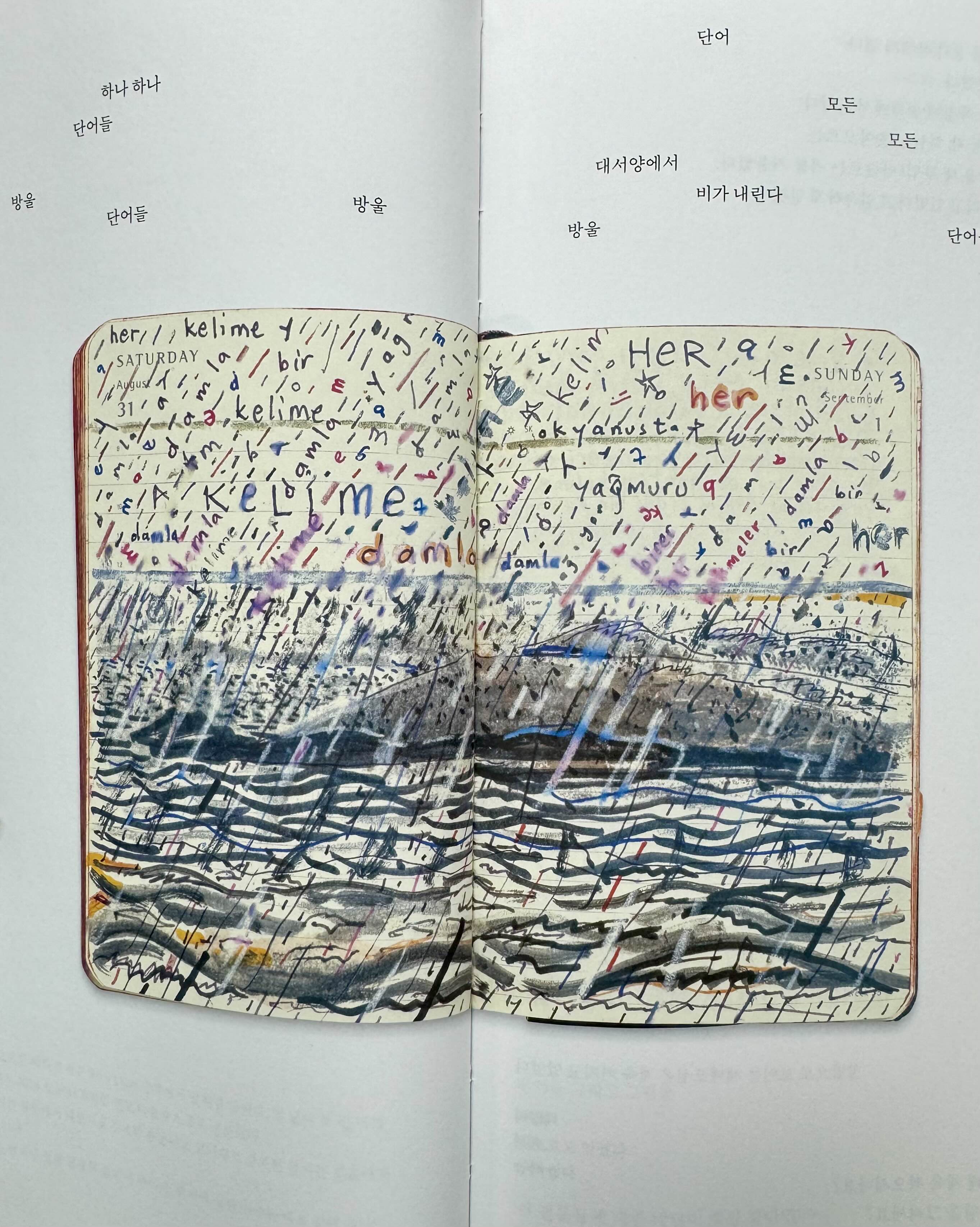 부러움 속에서 읽었다. 감탄하며 감상했다. 2개의 페이지, 한장이 완결된 세계가 된다. 제약 없이 마음에 있는 날것과 손 가는 데로 그려지는 선과 감정을 담은 색깔을 입힌다. 잘 쓰는 글씨 같지도 않은 글자들이 한 장 안에서 색깔을 바꿔가며 파편적으로 쓰여진다. 그림과 어우러지면서 말이다. 졸필에 없는 그림솜씨와 부족한 문학적 감수성은 이렇게 그저 부럽게 바라볼 뿐이다. 🥲