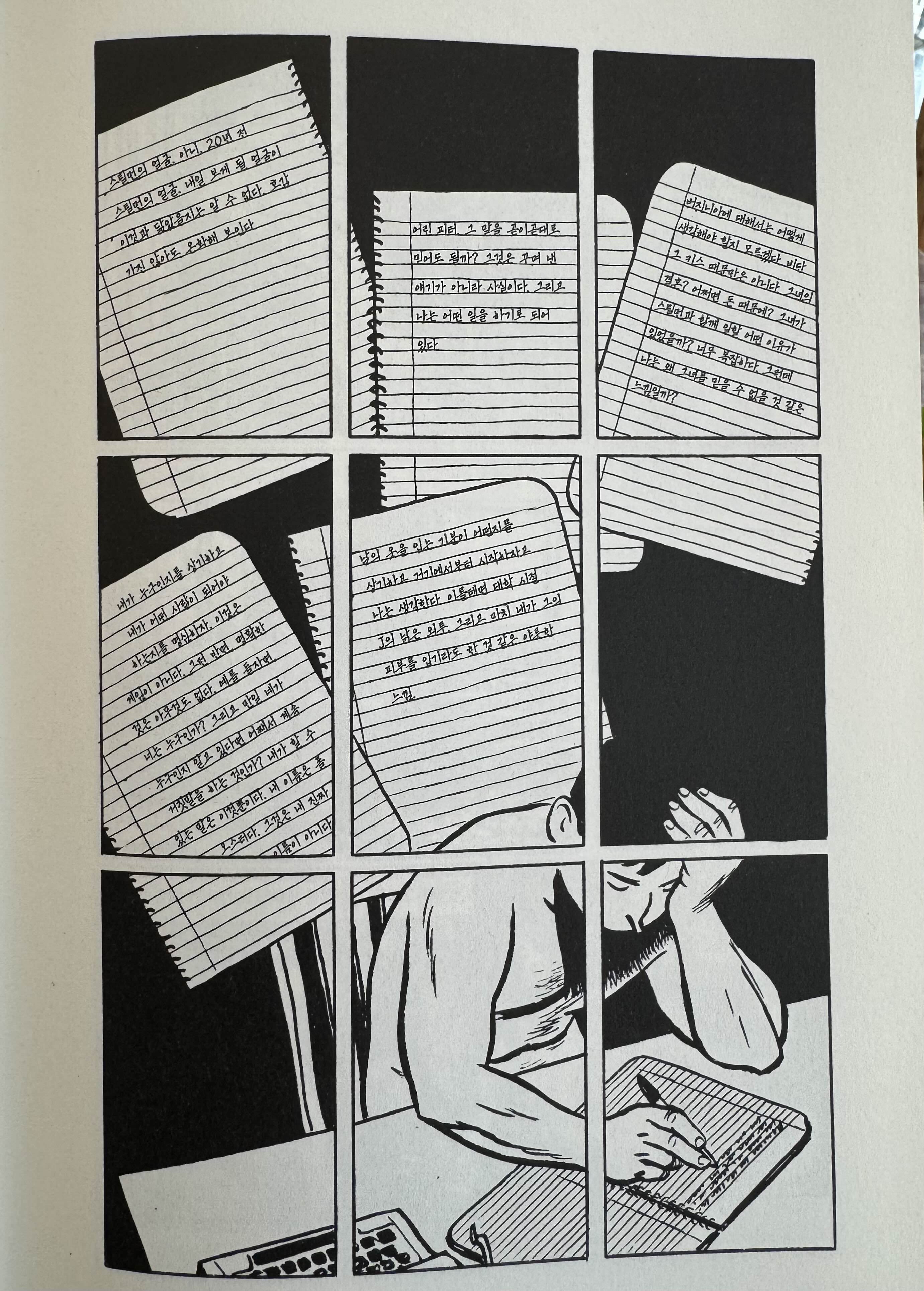 오랜만에 다시 읽었다. 아니 새로 읽었다. 그래픽노블로 만나는 뉴욕 3부작은 소설보다 더 작품의 중심철학에 가깝게 표현된다. 기하학적인 문양과 분열되는 이미지들 사이의 오스터의 문장들이 오래전, 그 모습 그대로 반짝이고 있었다.