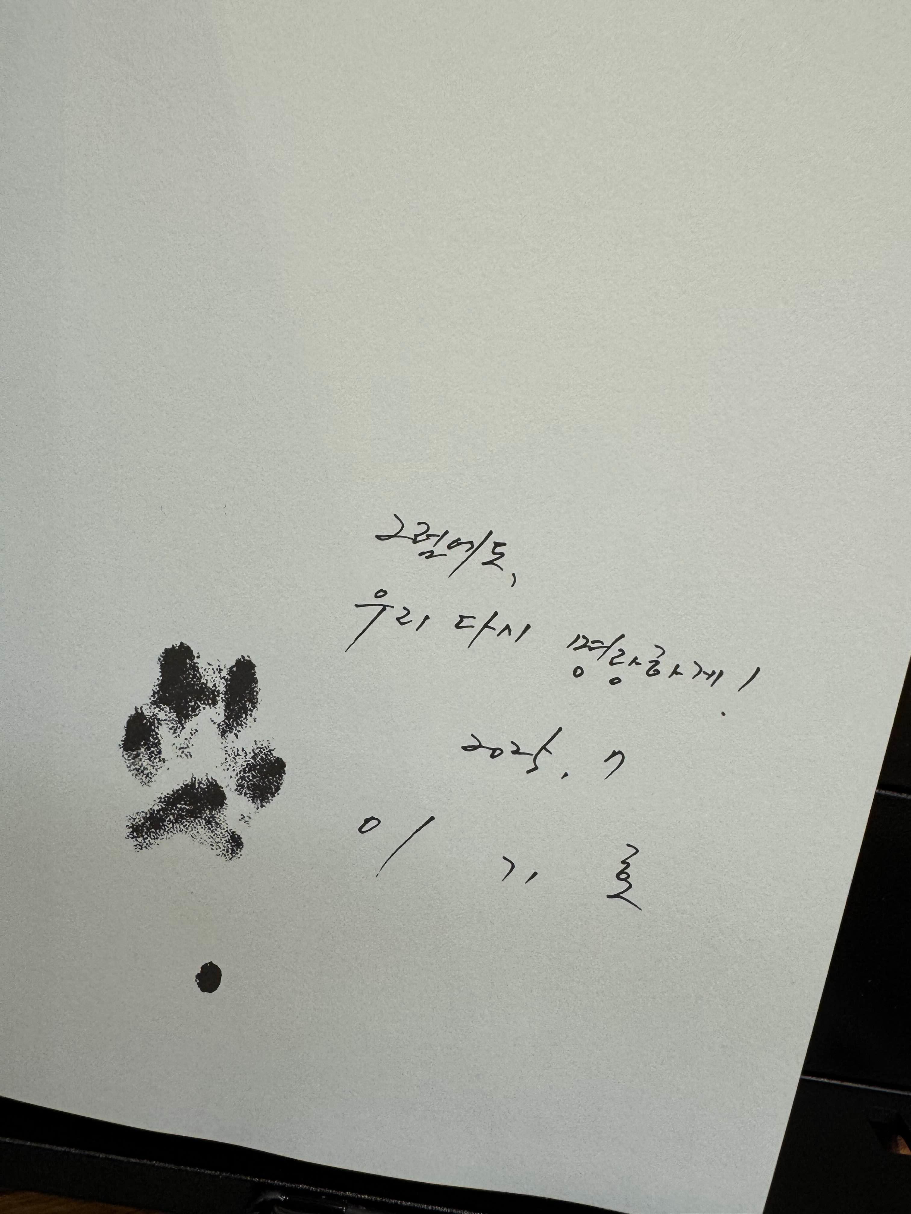 11년만에 이기호작가는 삼천만 원짜리 강아지 이야기라는 엉뚱한 장편을 들고 돌아왔다. 이 강아지 이야기가 500페이지가 넘는다. 책을 구입하면 실제 작가가 키우는 강아지 ‘이시봉’의 사진과 첫 장에 작가의 싸인과 함께 강아지의 ‘지장(?)’도 같이 인쇄되어 있다. ☺️ 일단 웃고, 읽기 시작하게 되어 있다.